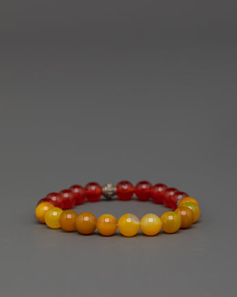 This stunning handcrafted bracelet is designed to make a statement while maintaining the ideal combination of elegance and sophistication. The bracelet features brilliant Natural Carnelian with Yellow Jade Beads, artificial beads, each measuring 8mm, strung together with a central metallic clasp that adds an extra layer of appeal to the design. The carefully chosen hues represent vitality, warmth, and positivity, making this bracelet an excellent choice for anyone looking to boost their energy and attitude. The design's symmetry and clean finish add to its ageless charm.
