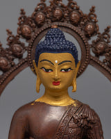 We only created the Three Buddha statue by machine using the traditional Himalayan art style. We have craved the statue using oxidized copper. We have gilded the face of each deity with genuine 24K gold. We are artisans from the Kathmandu Valley whose skill in creating vintage Vajrayana sculptures that accurately portray Buddhism has been passed down through the decades. In this Buddhist statue, all Buddhas are seen sitting serenely on the moon disc lotus seat. This statue may be used for various Vajrayana practices and daily yoga or meditation routines.