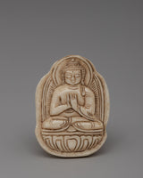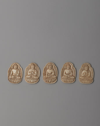 Enhance your spiritual practice with this stunning Five Dhyani Buddha set, handcrafted from ethically obtained buffalo bone. Each statue is 5cm tall and 3.5cm wide, with a single weight of 0.008kg, making it lightweight but powerfully meaningful. This collection includes Aksobhya, Amitabha, Amoghasiddhi, Ratnasambhava, and Vairocana Buddhas, each symbolizing a different aspect of enlightened consciousness. These sculptures are ideal for your meditation altar or sacred area, as they promote spiritual growth, attention, and balance. Vairocana Buddha, positioned in the center, represents the essence of dharma meditation, while the others radiate their wisdom from the four directions.