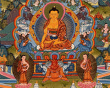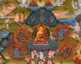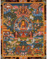 This Buddha Life Story Original Hand-Painted Thangka is a traditional Tibetan Buddhist artwork that intricately illustrates the key events and teachings from the life of Siddhartha Gautama, the historical Buddha. These thangkas are meticulously crafted by skilled artists who use natural pigments and fine brushes to create detailed and vibrant depictions on cloth or silk. The central figure of the thangka is often the Buddha himself, surrounded by scenes from his life, such as his birth in Lumbini, his enlightenment under the Bodhi tree, his first sermon at Sarnath, and his parinirvana or final nirvana. Each scene is filled with symbolic elements that convey deeper spiritual meanings, reflecting the rich tapestry of Buddhist philosophy and the path to enlightenment.
