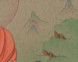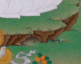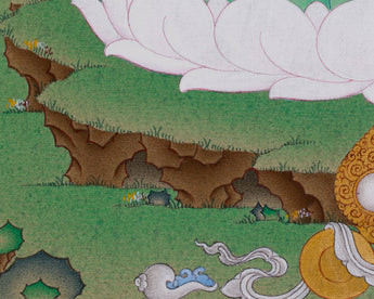 This thangka depicts him in his earth-touching mudra, symbolizing the moment he summoned the earth to witness his enlightenment. His golden-yellow form radiates serene wisdom, complemented by softly flowing maroon robes. Sitting on a pristine white lotus, he holds an alms bowl that signifies renunciation and harmony. The peaceful scenery behind—gentle hills, drifting clouds, and a solitary tree—creates a sacred, tranquil atmosphere that amplifies his enlightened presence. Invite the blessings of the Shakyamuni Buddha into your home—bring this thangka into your space today and honor the path of wisdom, compassion, and awakening.