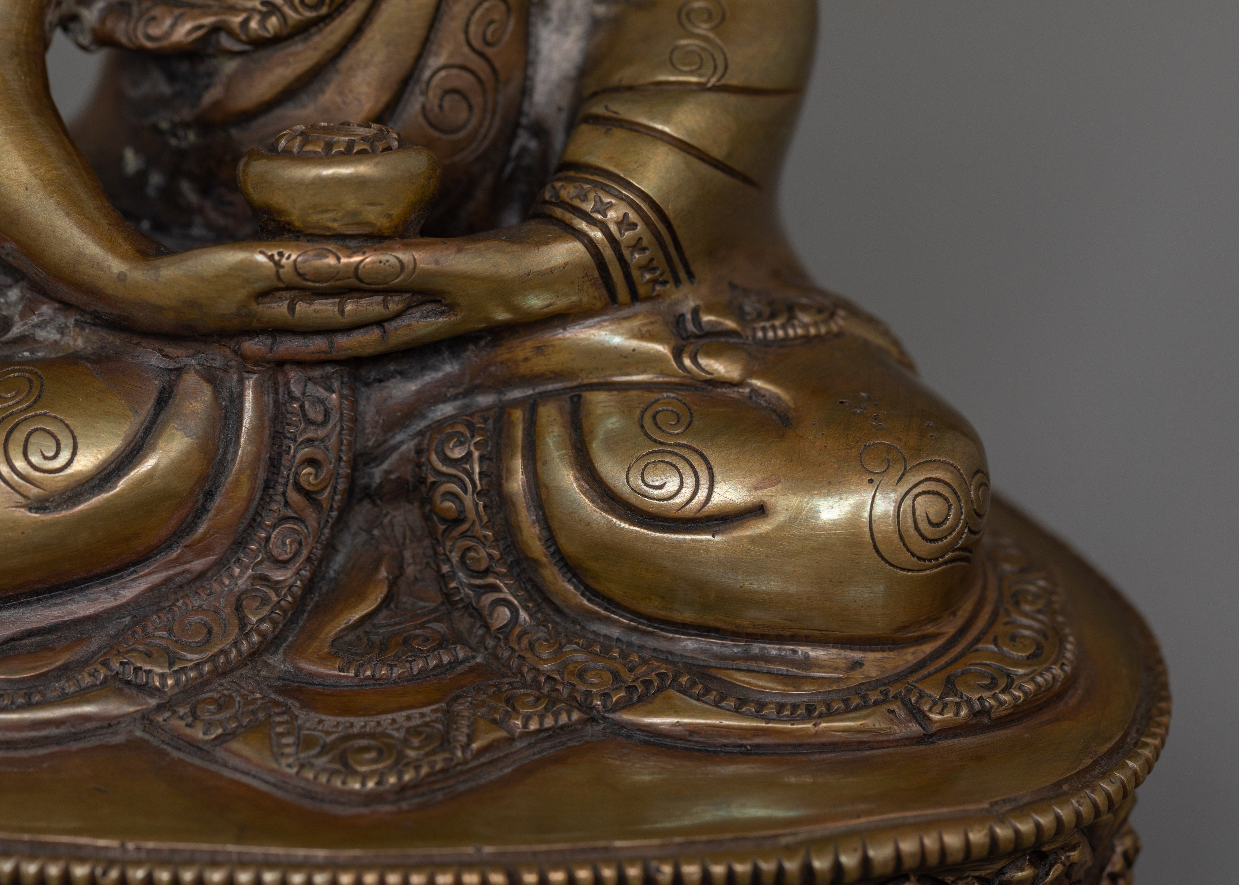 Amitabha Buddha embodies compassion, wisdom, and the transformative power of light. His most distinctive gesture is the meditation mudra (Dhyana Mudra), in which both hands rest in his lap, palms upward, and the thumbs touch to form a triangle. In this gesture, he holds a begging bowl or vase, symbolizing the nectar of immortality or spiritual nourishment. Amitabha is typically depicted seated in the whole lotus posture (vajra posture) on a lotus throne, signifying purity and spiritual awakening. His 48 vows form the foundation of his promise to guide all beings to rebirth in his Pure Land, where they can attain enlightenment. Through his embodiment of compassion, wisdom, and the transformative light he offers, Amitabha helps dispel ignorance and leads practitioners on the path to spiritual awakening.