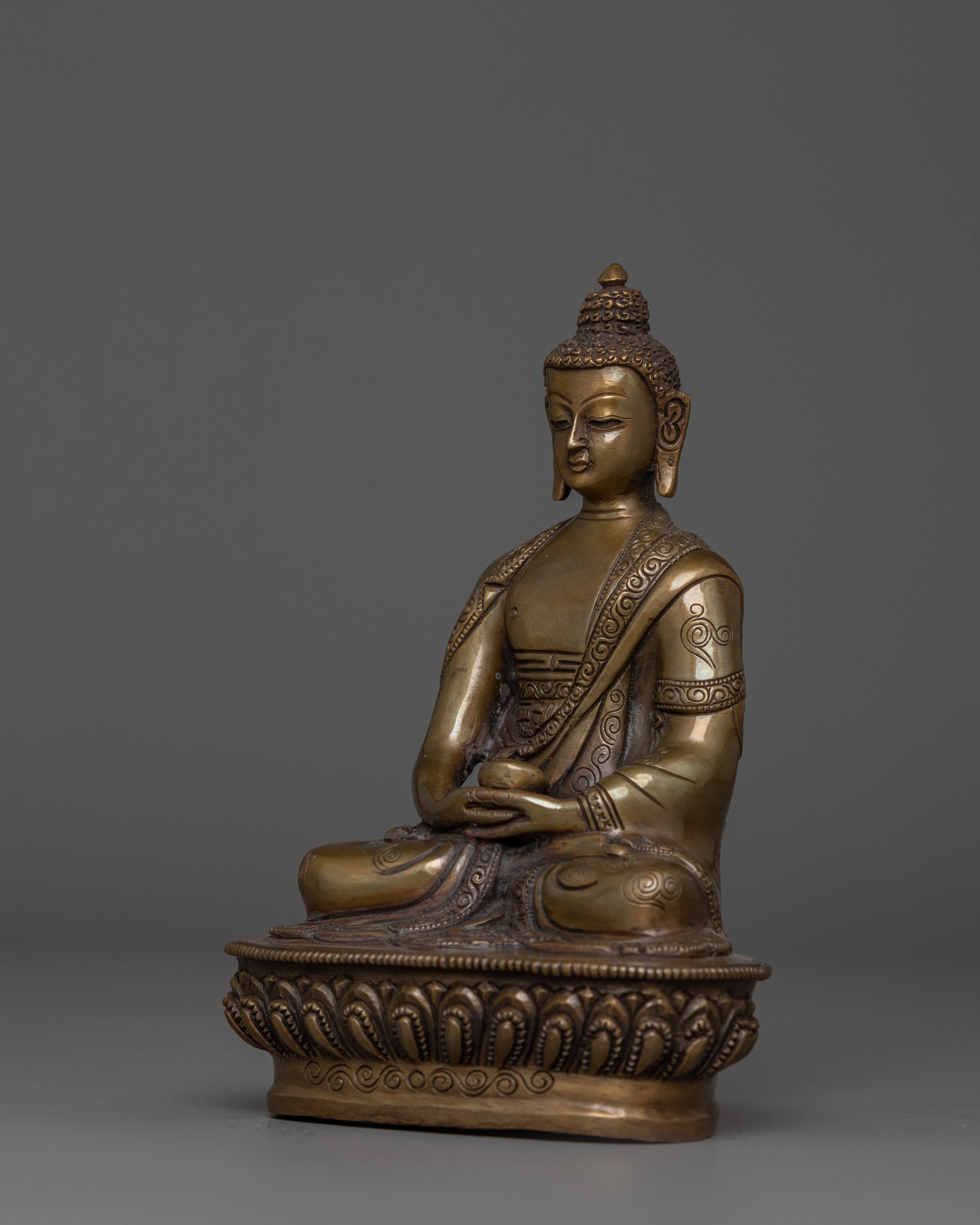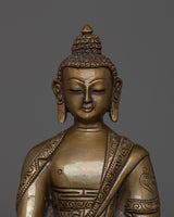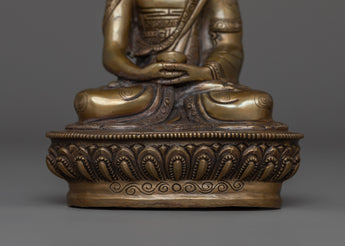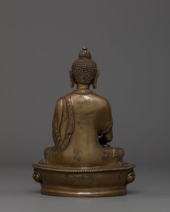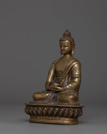 This Handcrafted statue of Amitabha Buddha stands at 5.9 inches (15 cm) in height and has a base width of 4.1 inches (10.5 cm), weighing 0.62 kilograms. It is made from an oxidized copper body. Designed by talented Nepalese artisans, this detailed sculpture is ideal for altars, meditation areas, or as a meaningful decorative item for individuals seeking to cultivate awareness in their daily life.