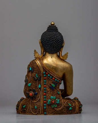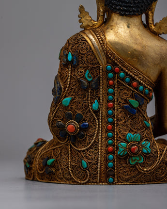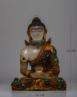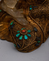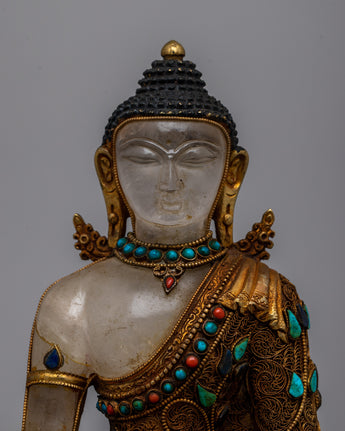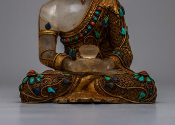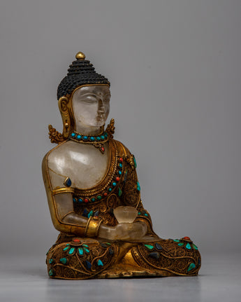 Begin your spiritual journey with the Amitabha Buddha Statue Crystal, a stunning blend of half copper and half crystal expertly created and embellished with beautiful electro-gold plating. This magnificent statue is embellished with ornate artificial turquoise and coral stone embellishments, representing purity and peace.