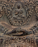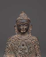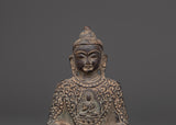 This magnificent Amitabha Buddha Statue for Buddhist decor is 14 cm in height, 10.5 cm in breadth, and weighs 0.69 kilogram. The statue, crafted from oxidized copper, has meticulous workmanship that symbolizes the eternal grace of Buddhist creativity. The aged copper surface gives it an ancient appearance, making it an ideal centerpiece for meditation areas, altars, and spiritual collections.