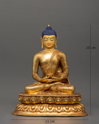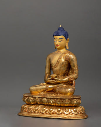 This elegant Amitabha Buddha statue, made of copper with gold plating, perfectly portrays the essence of serenity and enlightenment. The Buddha is represented in the Dhyana Mudra, a gesture representing deep concentration and inner tranquillity while sitting gracefully on a lotus. The beautiful gold plating enhances its spiritual presence, giving the statue a peaceful and dazzling image. This elegant art perfectly captures Amitabha Buddha's compassion and wisdom.