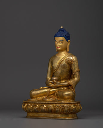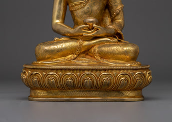 Amitabha is depicted in a tranquil seated posture, holding an alms bowl in his lap to symbolize renunciation and the simplicity of the enlightened life. His peaceful countenance represents the knowledge and compassion he bestows on individuals seeking rebirth in his Pure Land. This gesture demonstrates Amitabha's dedication to helping all creatures achieve spiritual awareness and freedom.