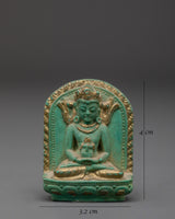 This Amitayus Bodhisattva statue is crafted from turquoise stone and adorned with acrylic colors. It measures 4 cm in height, 3.2 cm in width, and weighs just 0.016 kg. Amitayus, the Buddha of Infinite Life and Longevity, represents health, energy, and the extension of life. This well-crafted statue serves as an effective spiritual aid for meditation, altar displays, and holy areas.