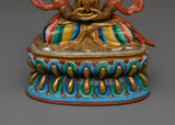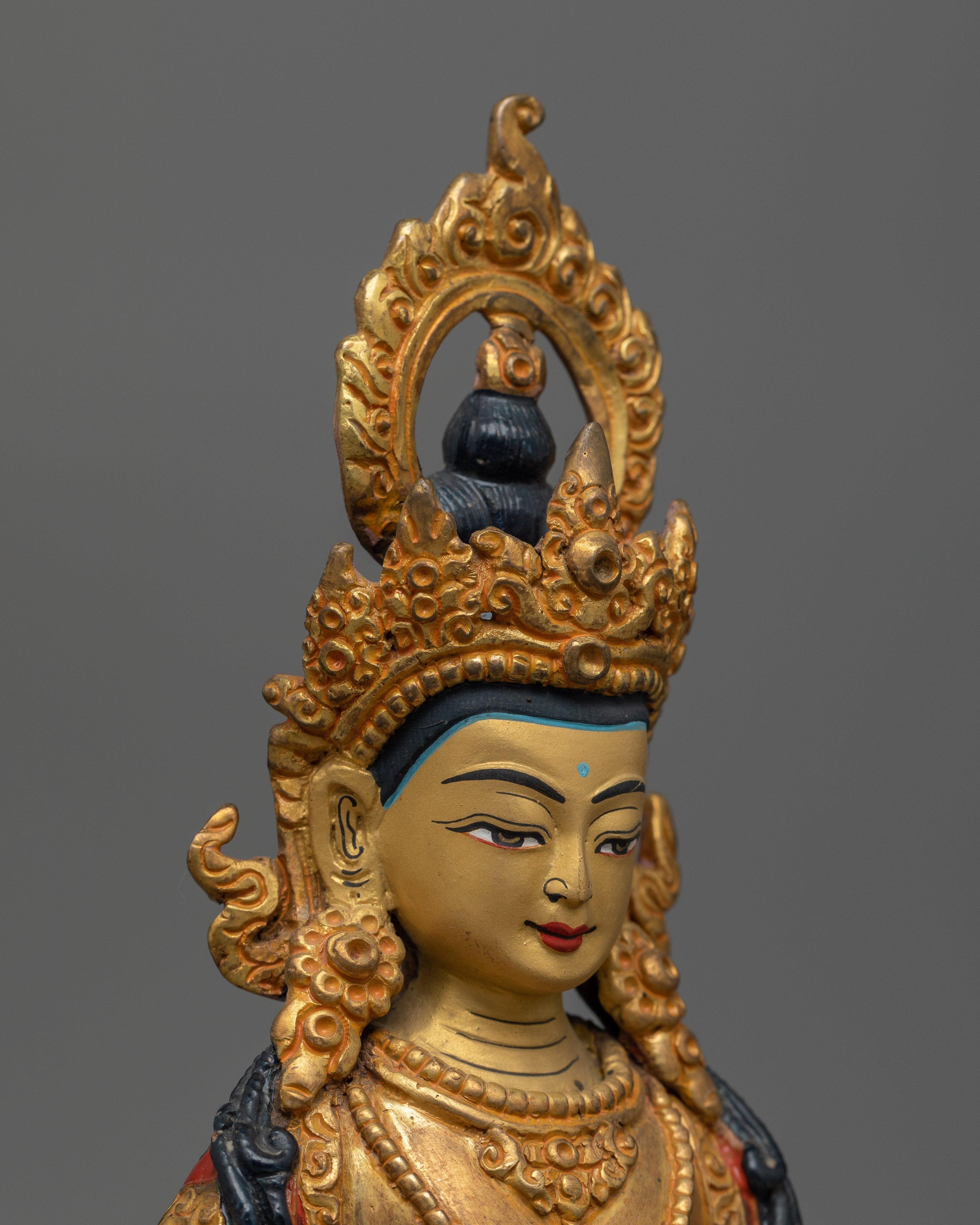 The Amitayus Handmade Colored Statue is 22 cm tall, skillfully crafted from fine copper, and adorned with vivid acrylic paintings and 24K gold gilding. This statue is a lovely addition to any area that hopes to evoke longevity and tranquility, as it perfectly represents the regal and serene aura of Amitayus. The deity's calm face and trademark qualities are accentuated by intricate carvings and a bright gold finish, signifying his role as the Buddha of Infinite Life.