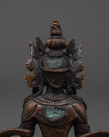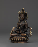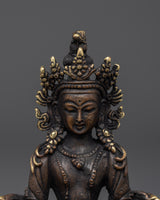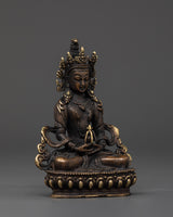 This figure has been expertly crafted by skilled artisans, depicting Amitayus' tranquil look and symbolic gestures of longevity, healing, and spiritual enlightenment. The antique finish lends depth and a spiritual sense to this timeless item.