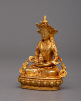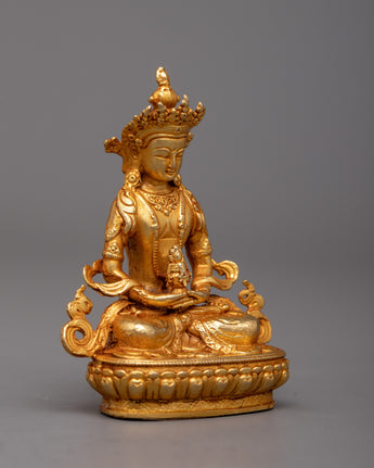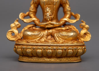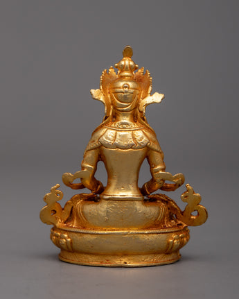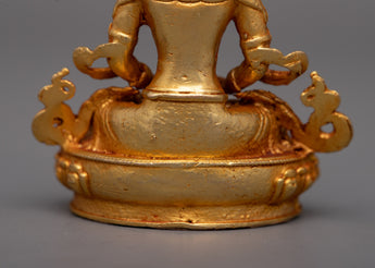 Standing at a modest 6.5 cm in height, the Amitayus Machine-Made Buddha Statue embodies the essence of longevity and vigor associated with Amitayus, the Buddha of Infinite Life. This statue, which was carefully made from copper using sophisticated machine processes, has details that stand up for Amitayus' divine qualities. With its brilliant 24k gold plating, it exudes a sense of spiritual grandeur and holiness.