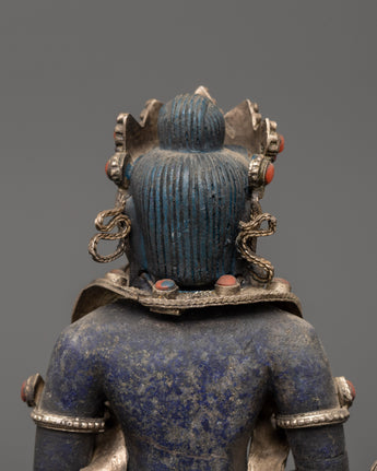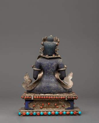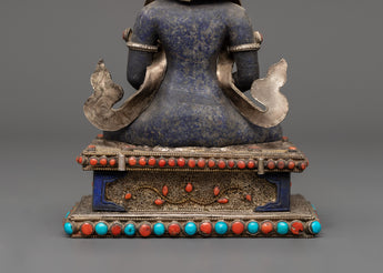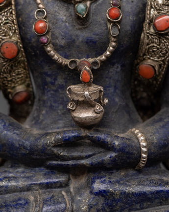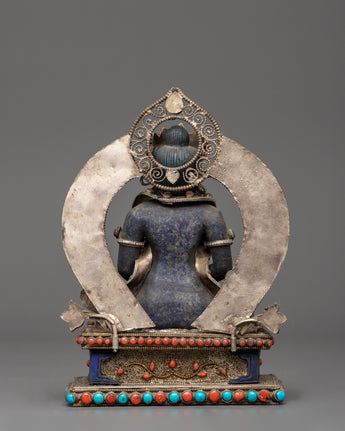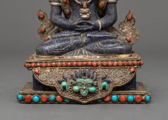 The Amitayus seated in the throne Statue, made from lapis lazuli, stands 15 cm in height and 11 cm in width, weighing 0.478 kg. The statue beautifully captures Amitayus, the Buddha of Long Life, on an intricately designed throne, seated in a meditative position. The body of the Buddha is crafted entirely from lapis lazuli, a stone symbolizing purity and wisdom, which creates a rich, deep blue tone that adds to the serenity and sacredness of the statue. The throne is beautifully carved with silver filigree work, giving it an elegant and refined appearance. At the front of the base, a kirtimukha (the face of a mythical being) is carved, and it is accentuated with artificial turquoise stones, bringing out its beauty and adding a sense of divine protection.