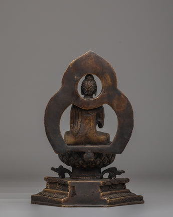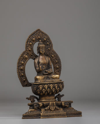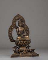 This Amogasiddhi Buddha meditation statue represents enlightened action, fearlessness, and spiritual accomplishment within Vajrayana Buddhism. Cast in bronze with a rich, traditional finish, this sacred Buddhist sculpture presents Amogasiddhi seated in serene meditation, radiating calm awareness and inner strength. Ideal for meditation spaces, Buddhist altars, or spiritual interiors, this statue supports focused practice and mindful living.