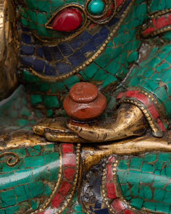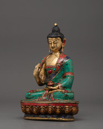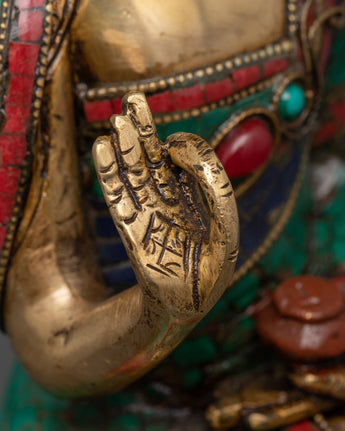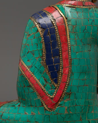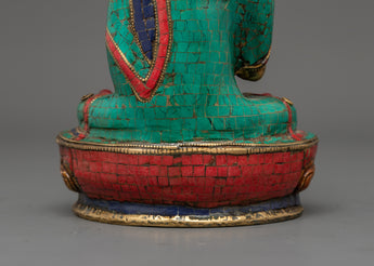 This Buddhist deity statue was precisely constructed by skilled artisans, ensuring that every detail portrays Amoghasiddhi's tranquil but powerful presence. The brass body represents strength and perseverance, while the brilliant turquoise and coral inlays amplify the statue's divine essence, encouraging tranquility, protection, and spiritual development. Placing this Tibetan Buddha statue in your holy place promotes fearlessness, clarity, and transformation, making it an excellent choice for meditators, spiritual practitioners, and collectors of Buddhist art.