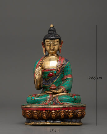 This Amoghasiddhi Buddha statue, masterfully carved from brass and embellished with imitation turquoise and coral inlays, symbolizes fearlessness, wisdom, and the ability to combat negative energy. As one of the Five Dhyani Buddhas, Amoghasiddhi represents the north and all Buddhas' enlightened actions. This sacred sculpture, at 20.5cm tall and 13cm at the base, is ideal for altars, meditation rooms, and Buddhist home decor.