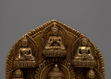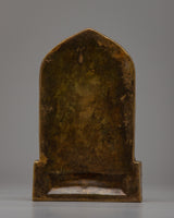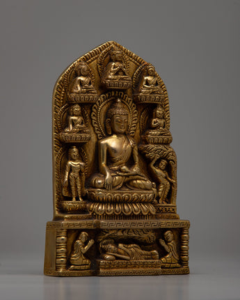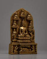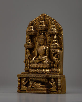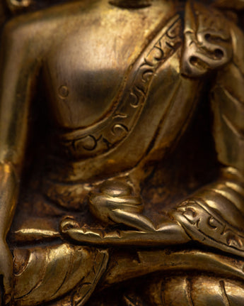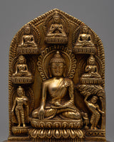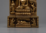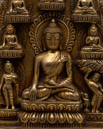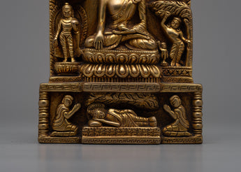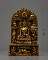 Bodhisattva Buddha Shakyamuni Statue is depicted in the statue sitting on a multitiered platform in the lotus pose, signifying his elevated and enlightened state. His hands are raised in the mudra of touching the Earth, symbolizing the time he called the Earth to witness his release from the cycles of reincarnation beneath the Bodhi tree.