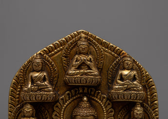 The statue's backdrop is beautifully sculpted, with many smaller Buddhas in meditation stances nestled within an exquisite alcove. This arrangement symbolizes Buddha's omniscience, with each small figurine representing a distinct facet of his teachings and values.