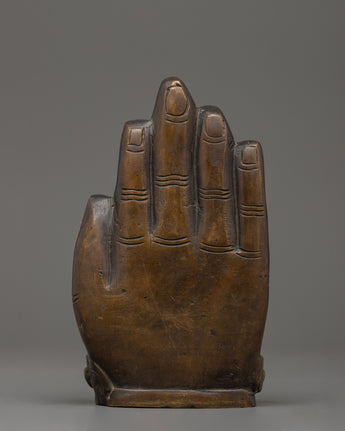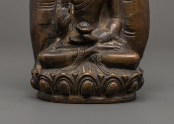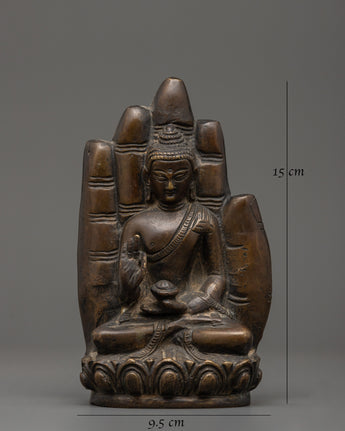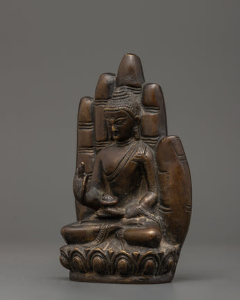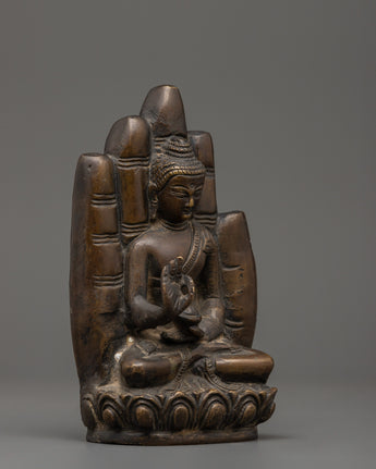 This sculpture is skilfully cast in a metal body with a gorgeous brass finish, reflecting complex craftsmanship influenced by Himalayan creative traditions. Its highly crafted lotus foundation and styled backdrop enhance the sculpture's depth and spiritual strength. This Amogasiddhi Buddha statue, ideal for meditators, Buddhists, or anybody interested in inner transformation, is more than just decoration; it's a potent spiritual tool that promotes clarity, strength, and transcendence.