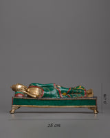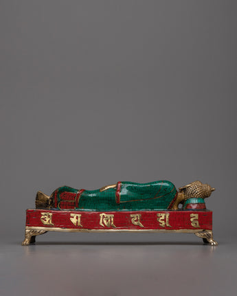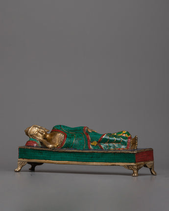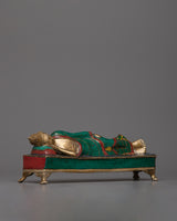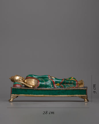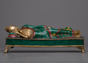 Introducing the Brass Reclining Buddha Statue, which is skillfully handcrafted on a brass body and features stunning turquoise and coral stone inlays. This magnificent statue depicts a reclining Buddha, portraying a moment of peaceful repose and enlightenment.