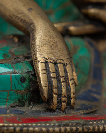 Meticulously sculpted, this statue showcases the artistry of its brass body and the vibrant inlays, creating a harmonious blend of aesthetics and spirituality.