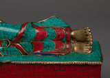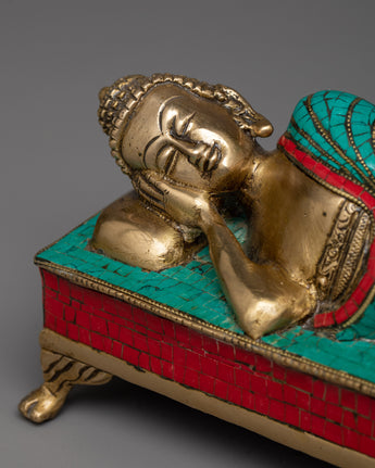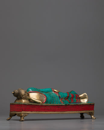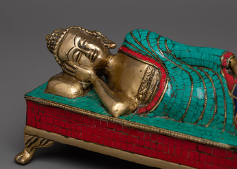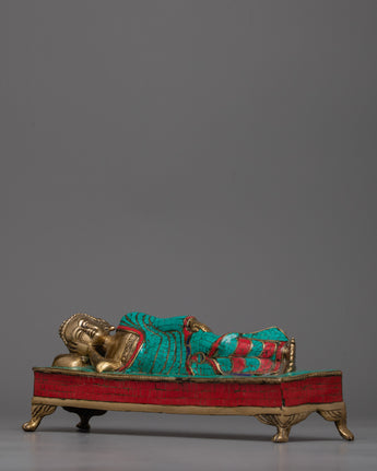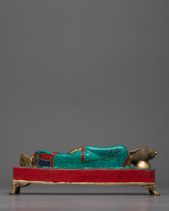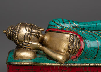 The statue, adorned with magnificent turquoise and coral stone inlays, depicts the Sleeping Buddha's tranquil rest with great attention to detail. The addition of these colorful stones enhances the piece's spiritual and visual appeal.