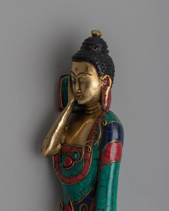 The statue is made of brass and decorated with imitation coral and turquoise stones, giving it a colorful yet spiritual appearance. The delicate inlay work represents traditional Himalayan workmanship, making each piece unique. This relic, weighing 1.08 kg, is easy to place on display. Whether for your own spiritual practice or as a thoughtful present, this Sleeping Buddha evokes tranquility and timeless beauty, making it a beloved symbol of peace and mindfulness.