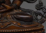 The Buddha Amitayus Copper Statue, masterfully created on an oxidized copper body, is a timeless representation of long life and infinite compassion in Tibetan Buddhism. Standing 17 cm tall and 12.5 cm wide, this statue displays a peaceful presence while expressing the essence of endless energy and spiritual understanding. The intricate details, from the graceful posture to the fine craftsmanship, indicate the statue's spiritual value and role in guiding practitioners to a healthy and enlightened existence.