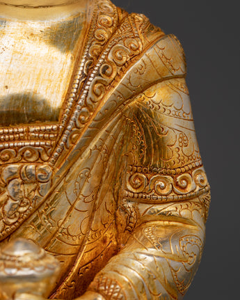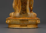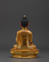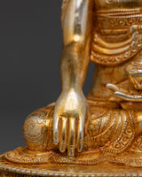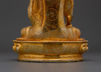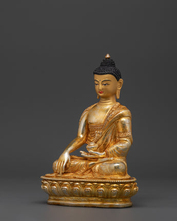 The Buddha Shakyamuni statue is an intricately handcrafted piece produced in our studio and designed with unique Nepali motifs. The Buddha is depicted seated on a moon-disc lotus and holds an alms bowl in his right hand while performing the 'Bhumisparsa Mudra,’ representing the Buddha's awakening as he claimed the earth as his witness. This piece is hand-carved from copper and partially plated in gold.