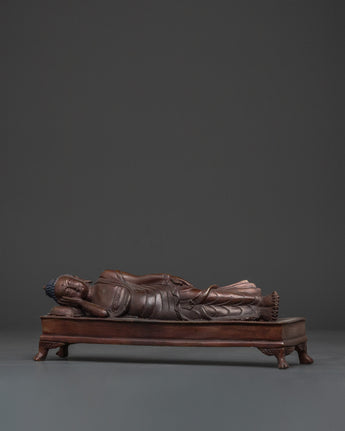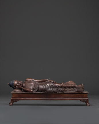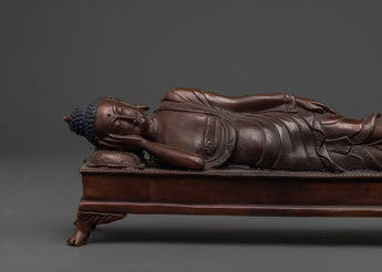 This handcrafted oxidized copper Buddha sleeping sculpture, measuring 9cm tall and 28cm wide, is elegant, with Buddha's calm reclining attitude. It depicts the uddha's final moments before entering parinirvana, representing ultimate serenity and enlightenment. The intricate craftsmanship and careful design make it an ideal addition to any meditation room, altar, or spiritual home decor collection.