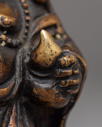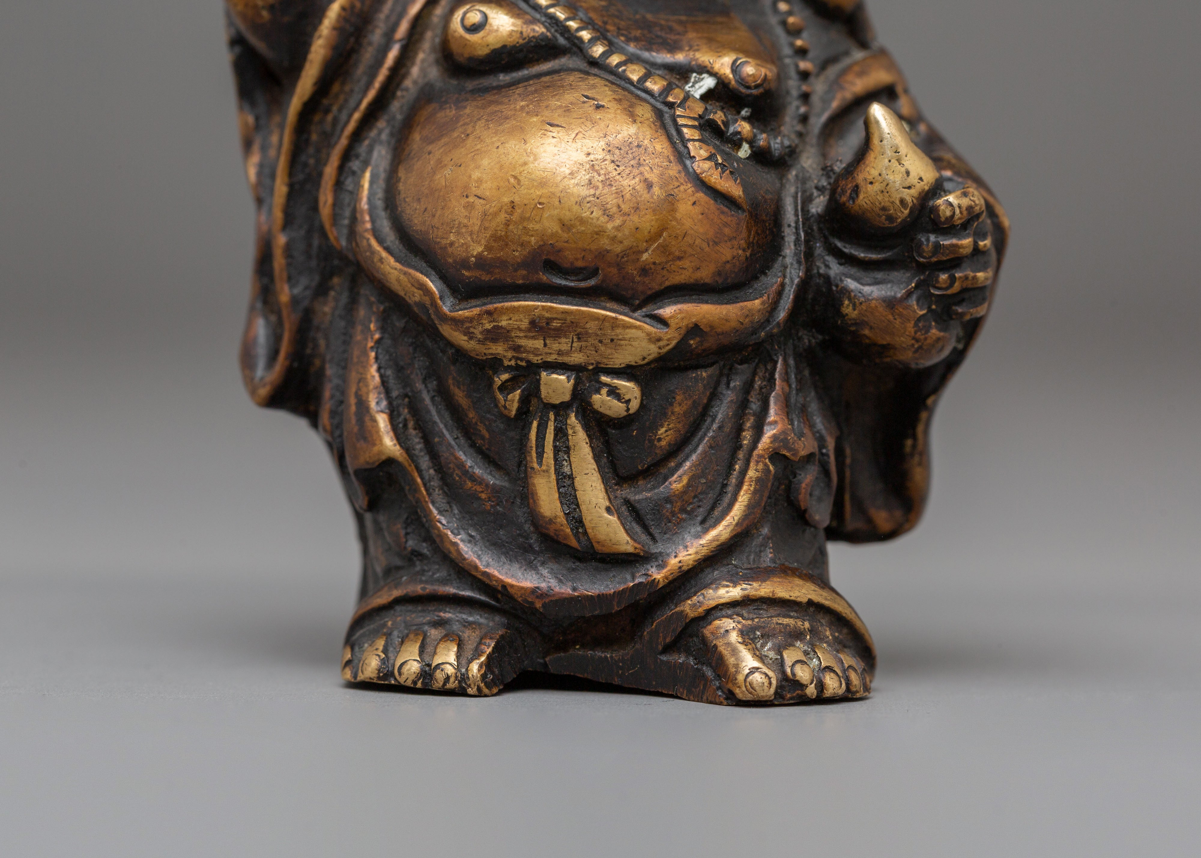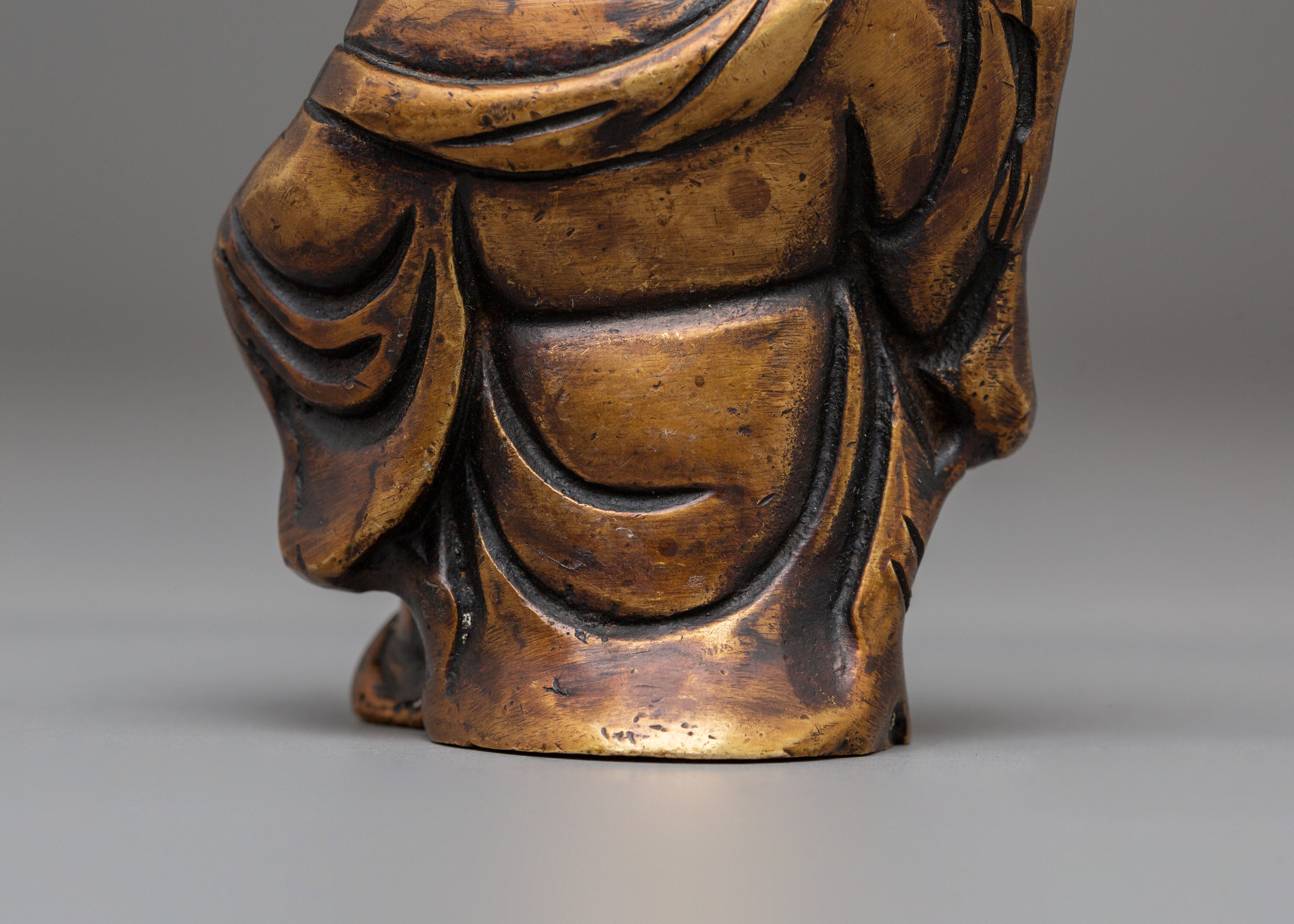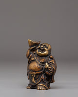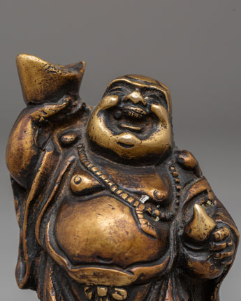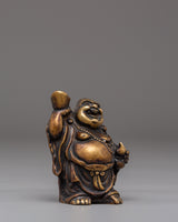 This handmade bronze Laughing Buddha statue features a cheerful expression, a rounded belly, and a relaxed posture—traditional symbols that represent contentment, generosity, and freedom from worries. The smooth contours and detailed craftsmanship highlight flowing robes and symbolic form, making it both visually appealing and spiritually meaningful. Bronze, known for its grounding and protective qualities, enhances the energy of this figurine while complementing modern and traditional interiors alike.