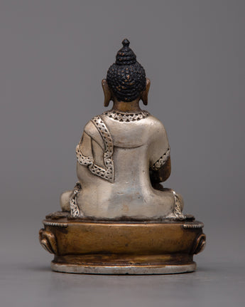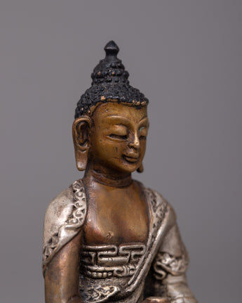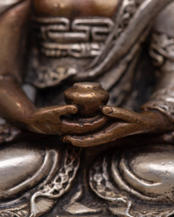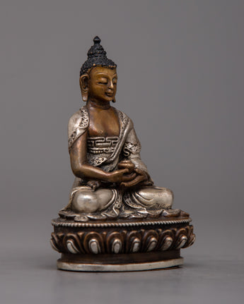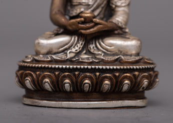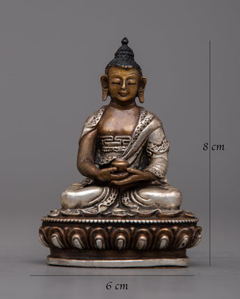 The 8-cm-tall Copper Amitabha Buddha Statue is skillfully created on an oxidized copper body using a machine-made process and embellished with silver plating. This magnificent statue represents the enlightened attributes of wisdom, compassion, and boundless light.