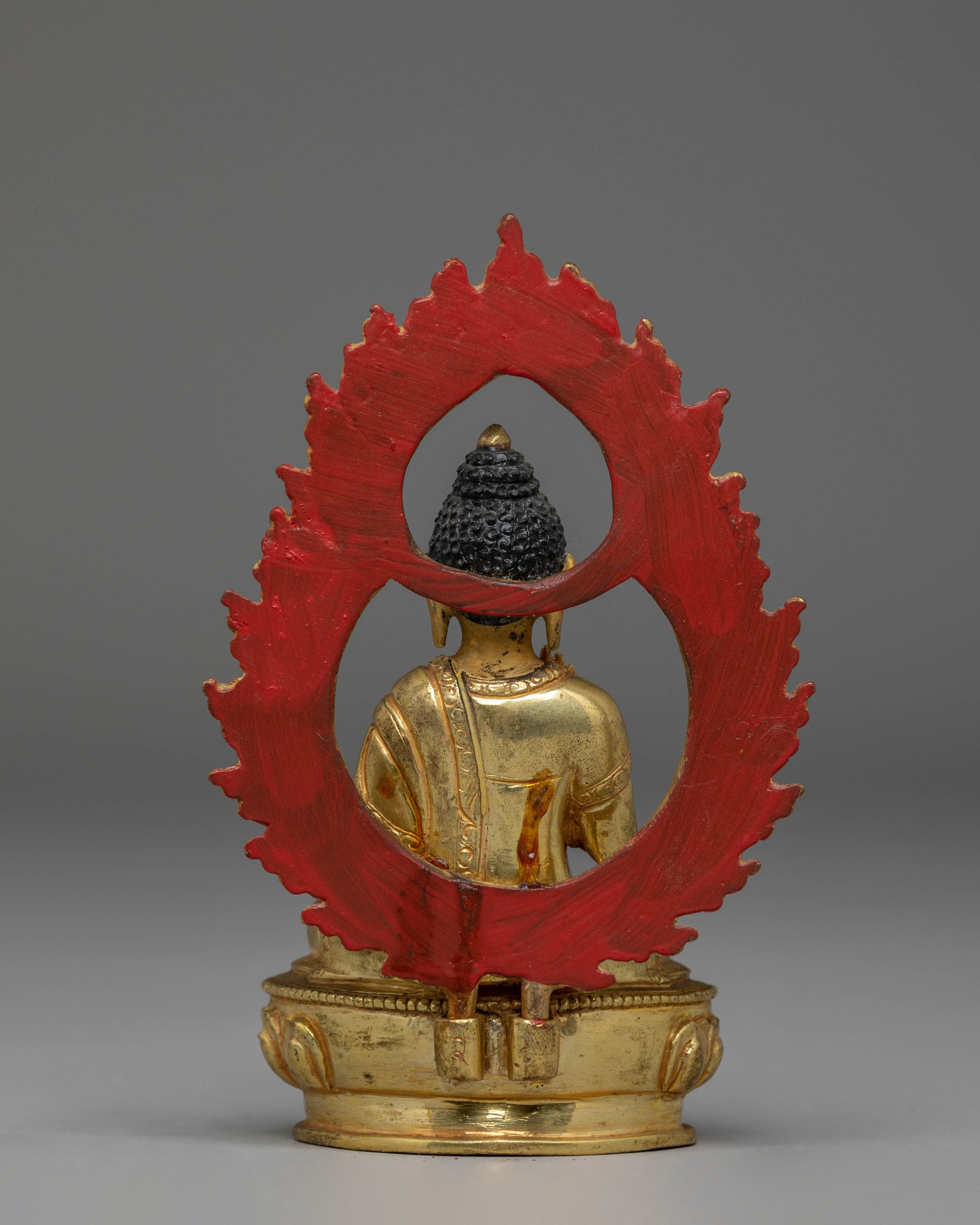 The statue features Amogasiddhi in the abhaya mudra—the gesture of fearlessness and protection—symbolizing courage, reassurance, and the removal of inner and outer obstacles. The beautifully carved lotus throne enhances the symbolism of spiritual awakening, while the flame-like aureole surrounding the Buddha represents the luminous energy of enlightened action. Every detail, from the delicate facial features to the ornate robe patterns, showcases exceptional traditional craftsmanship.