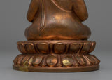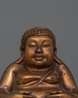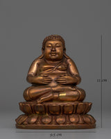 This Decorative Laughing Buddha statue, made of oxidized copper, stands 11 cm tall, 9.5 cm wide, and weighs 0.16 kilogram. The Buddha is represented in traditional pose, resting on a circular lotus base with crossed legs to represent purity and enlightenment. The lotus, a significant symbol in Buddhist art, represents the road toward spiritual awakening, adding to the statue's sacred and ornamental appeal. This compact yet intricate sculpture is ideal for meditation nooks, home altars, or any other location where peace is desired.