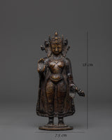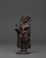 This sculpture's design highlights meticulous details, from the Buddha's tranquil look to the delicate folds of the robe. Hand gestures (or mudras) are meticulously designed to represent blessings and protection. The designs on the figure represent the Buddha's wisdom and compassion, bringing peace and mindfulness into your surroundings. The oxidized copper finish highlights the sculpture's unique patina, giving it a standout feature in any setting.