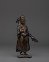 This Dipankara Buddha Sculpture is a magnificent handcrafted work of art that can provide tranquility and spiritual meaning to any environment. Made of oxidized copper, it brings about the calm essence of the Dipankara Buddha, an adored figure in Buddhist tradition. It is 18cm in height, 7.5cm in breadth, and weighs 1.03kg, making it a great addition to your house, meditation area, or spiritual collection.