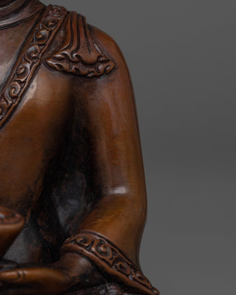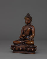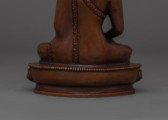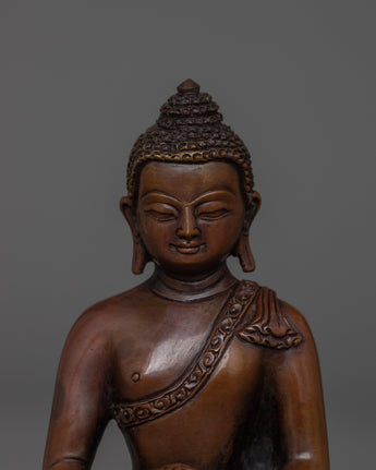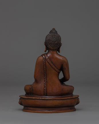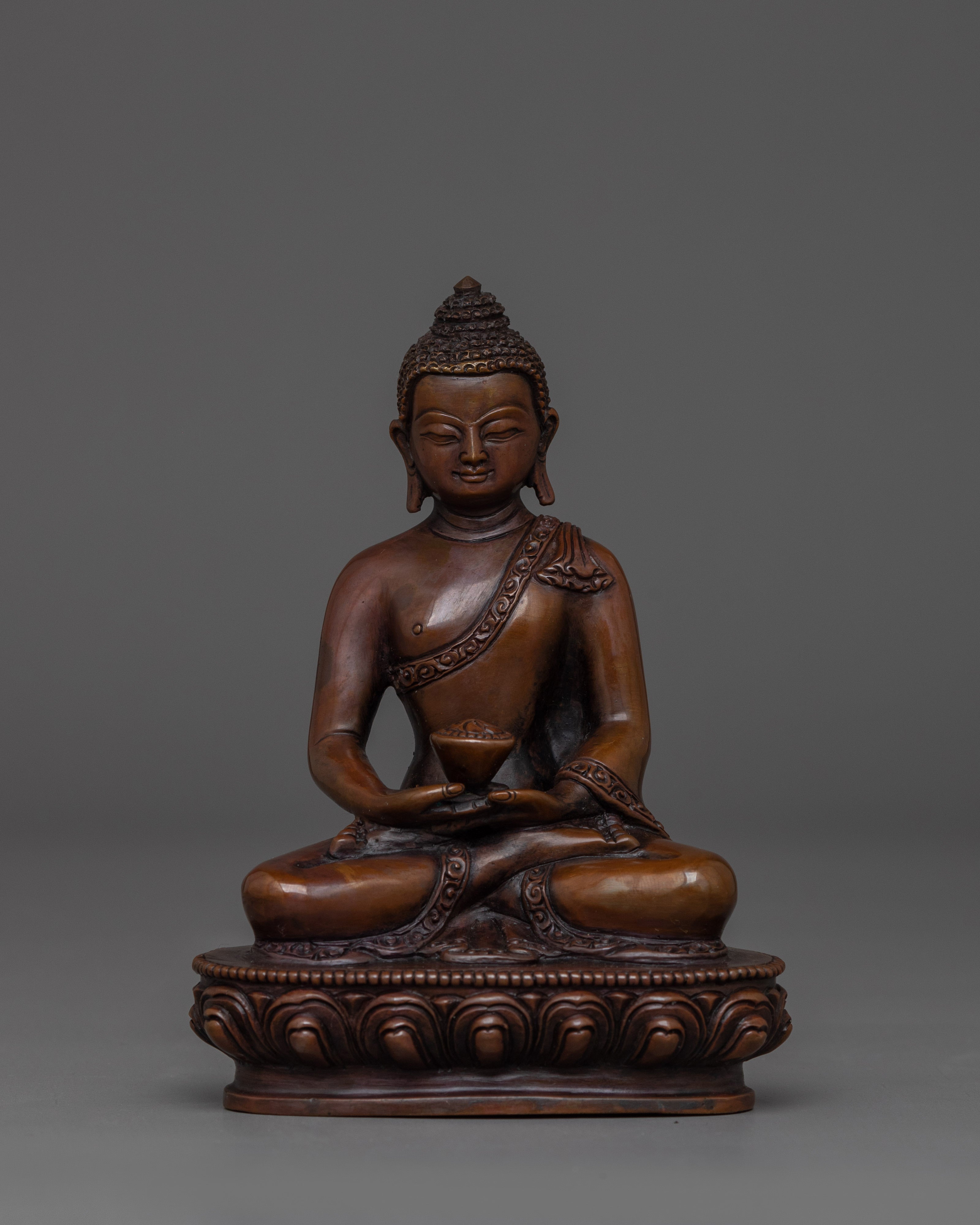 This oxidized statue of Amitabha Buddha, also known as the Ruler of the Pure Land, stands at 5.3”/13.5cm in height and 4.1”/10.5cm at the base, weighing 0.47 kg. Crafted from an oxidized copper body, it exudes a timeless appearance. Expertly designed by skilled Nepalese artisans, this detailed sculpture is perfect for altars, meditation spaces, or as a meaningful decor item for those seeking spiritual awareness in their daily life.