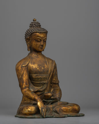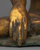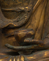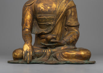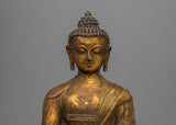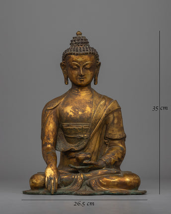 This exquisite Shakyamuni Buddha statue is a wonderful work of Tibetan craftsmanship that captures the Buddha's tranquil and enlightened appearance. Standing 35 cm tall and 26.5 cm wide, this statue is made of copper and plated with electro gold, giving it a stunning and everlasting aspect. Weighing 4.54 kg, it has a significant weight and presence, rendering it an effective complement to any altar or sacred area. The Buddha is shown in a classic meditation stance, representing inner calm, knowledge, and the path to enlightenment.