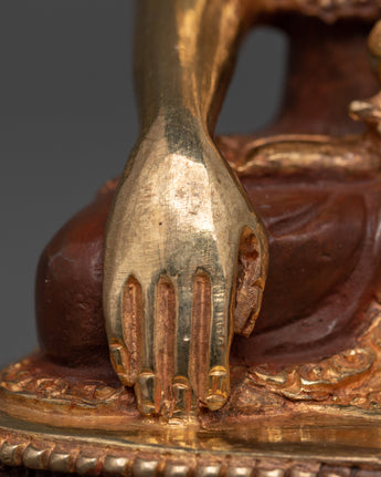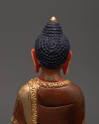 The Elegant Shakyamuni Buddha Statue is a handmade masterwork representing peace and enlightenment. This stunning statue, measuring 15.5 cm tall and 10.5 cm broad, is skillfully fashioned from oxidized copper and plated with gold, giving it a timeless and religious appearance. Shakyamuni Buddha, the historical Buddha and founder of Buddhism, represents the height of spiritual awareness and inner peace.