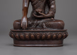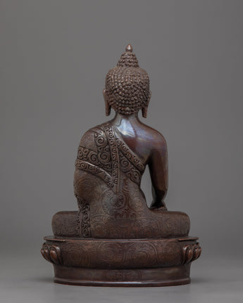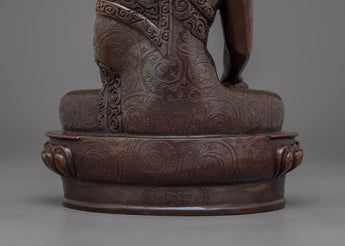 The Enlightened Meditating Shakyamuni Buddha Sculpture symbolizes the Buddha's deep teachings and the path to spiritual awakening. This handcrafted statue is 8.7" (Height) x 6.3" (Base) and weighs 1.51 kg. It is made of oxidized copper. This sacred statue, created by expert Nepalese artisans, represents the craftsmanship of Himalayan Buddhism, making it an inspirational addition to altars, meditation places, or sacred collections.