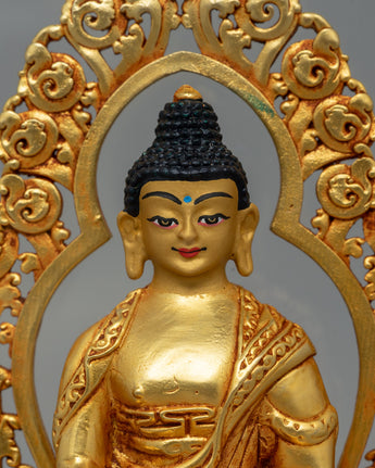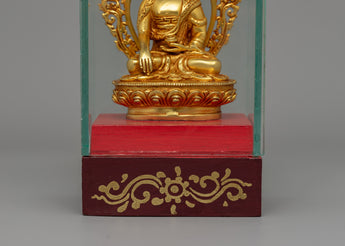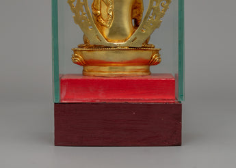 This Glass-Enclosed Shakyamuni Buddha Statue is a refined representation of the historical Buddha, precisely carved from copper and finished in beautiful gold plating. With measurements of 19 cm in height and 9 cm in breadth and a weight of 0.888 kg, this sacred sculpture is housed in a glass case that provides both elegance and safety. The combination of precious craftsmanship and delicate detailing makes this an ideal altarpiece, meditation aid, or spiritual home décor item.