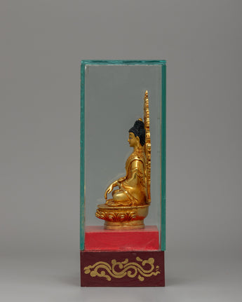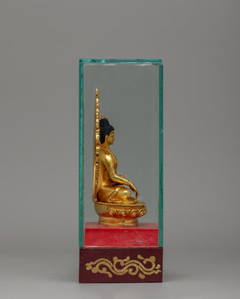 In Buddhist artwork, Shakyamuni Buddha is shown in the earth-touching mudra, which represents his enlightenment under the Bodhi tree. Sitting on a lotus pedestal, this divine depiction emits calm, knowledge, and inner peace. The glass enclosure retains the Buddha statue's sanctity, making it suitable for prayer rooms, meditation spaces, or sacred altars. Whether employed for devotion, mindfulness, or creative enjoyment, this Gold-Plated Shakyamuni Buddha Sculpture is a timeless symbol of spiritual grace and enlightenment.