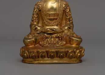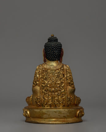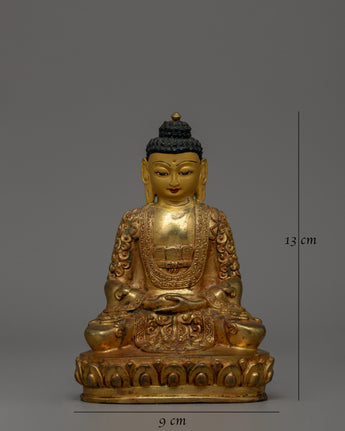 Gold-plated Amitabha Buddha, also known as the Buddha of Infinite Light, is a significant figure in Tibetan and Mahayana Buddhism, representing wisdom, infinite compassion, and the pure land of enlightenment. This handcrafted gold-plated copper statue, measuring 13 cm in height and 9 cm in base, elegantly embodies the sense of inner serenity and spiritual awakening. Weighing 0.54 kg, it is an excellent addition to meditation areas, Buddhist shrines, or sacred altars.