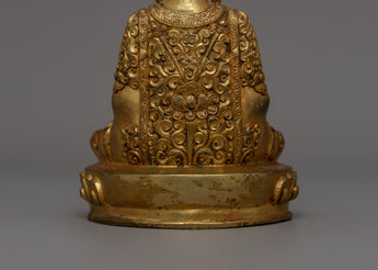 The representation of Amitabha Buddha has profound spiritual significance. Seated in Dhyana Mudra (meditation gesture), his peaceful admire exudes tranquility and wisdom. The exquisite gold plating adds to his sacred aura, and the elaborate craftsmanship on his robe and seat emphasizes his function as a celestial guide to enlightenment. Amitabha is said to guide devoted practitioners to Sukhavati, the Pure Land, where they might achieve total freedom and enlightenment. This revered statue symbolizes inner light, attention, and the path to waking.