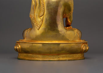 This Gold-Plated Shakyamuni Buddha statue stands 33.5cm tall and 24cm broad, weighing 4.02kg. The statue is made of copper and finished with bright gold plating. It depicts the Buddha in a serene meditative stance, with delicate decoration on his robes and a lotus base.  The gold plating heightens its holy presence, making it a significant focal point for meditation and devotional practice. It also makes an ideal present for individuals who value Buddhist spirituality.
