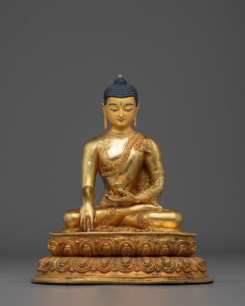 This golden statue of Shakyamuni Buddha is a stunning depiction of the Buddha, representing peace, wisdom, and spiritual enlightenment. This beautiful statue, measuring 27.5cm tall by 24cm wide and weighing 2.94kg, is precisely carved from copper and gold-plated for a brilliant finish that enhances its divine presence. Shakyamuni Buddha is represented in the classic earth-touching mudra (bhumisparsha), symbolizing his moment of enlightenment and inviting the Earth to witness his profound realization. The peaceful expression, intricately detailed robes, and lotus base embody traditional Tibetan artistry and the essence of meditation.