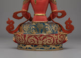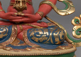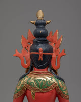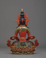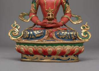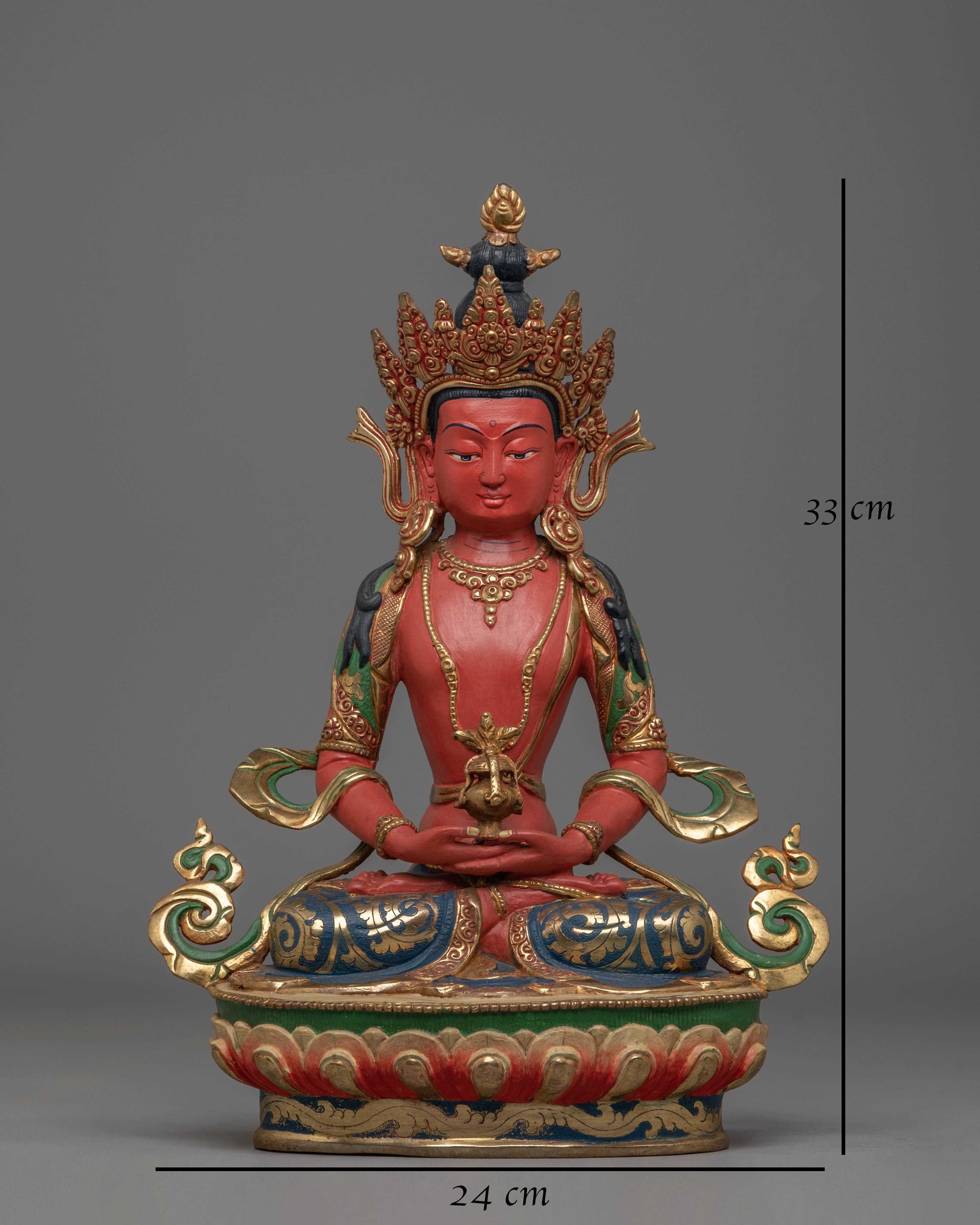 Experience the exquisite elegance of the Amitayus Buddhist Copper Statue, the Buddha of Infinite Life, as captured by this masterfully handmade statue. It stands 33cm tall and has a copper body that has been beautifully gilded with gold-plated. It is embellished with skillfully intricate acrylic paintings. This statue is more than just art; it's a holy symbol of longevity, strength, and spiritual enlightenment that will enhance your meditation room or shrine.