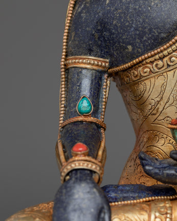 Invite the blessings of peace, clarity, and spiritual awareness into your home with this Handcrafted Enlightened Shakyamuni Buddha Statue. Perfect for meditation spaces, prayer rooms, or as a meaningful gift, this gold electroplated copper Buddha sculpture brings balance and sacred beauty to any environment. The lapis stone accents enrich its symbolic presence, making this Shakyamuni Buddha Statue a remarkable expression of enlightenment and inner calm.