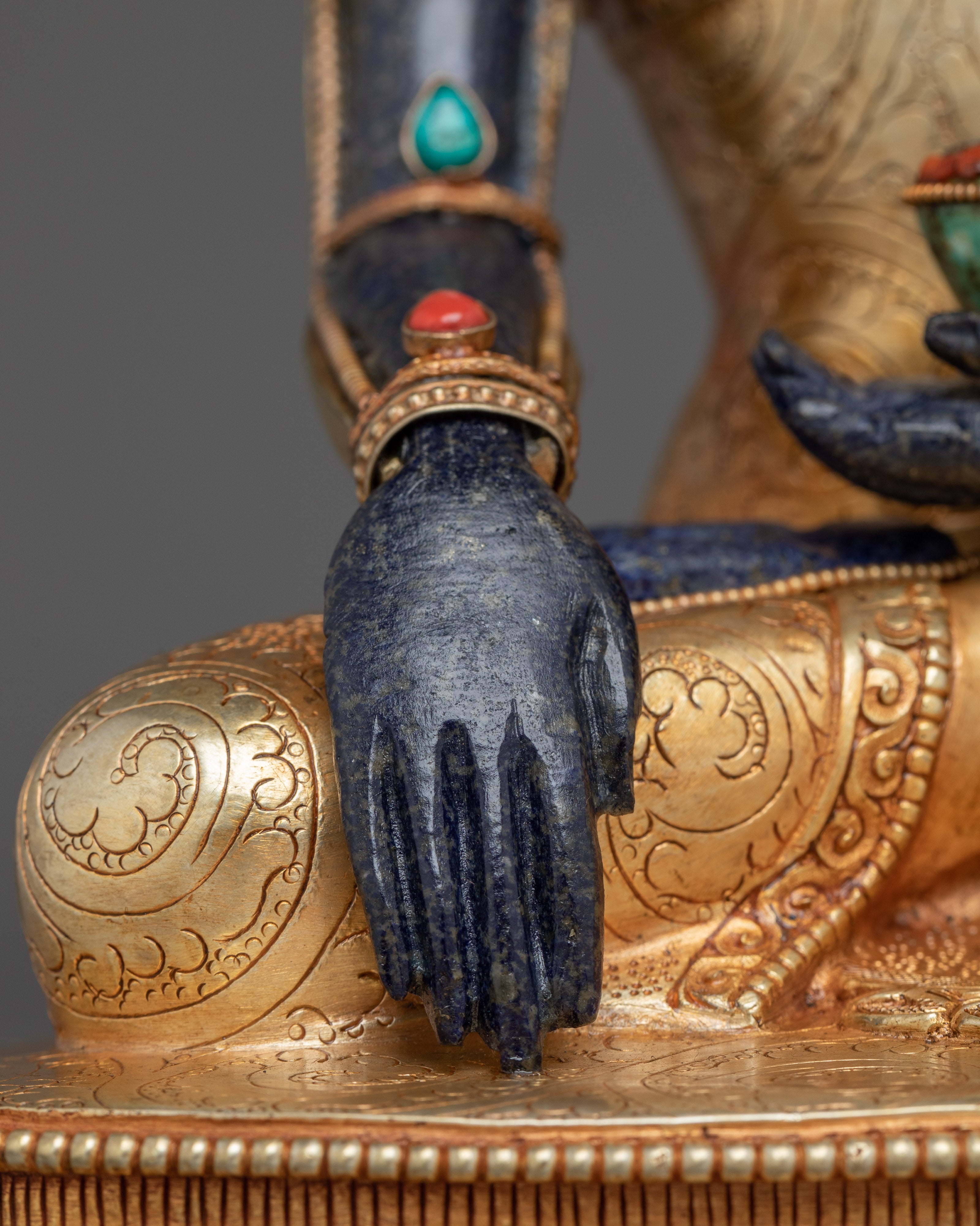 The statue’s robes are delicately engraved with flowing patterns and adorned with natural lapis stones, enhancing its sacred character and vibrant appearance. The combination of the lustrous gold finish with the rich blue tones of lapis creates a captivating aura of tranquility and devotion. Every feature is thoughtfully crafted to represent the Buddha’s journey toward enlightenment and the essence of compassion and mindfulness.