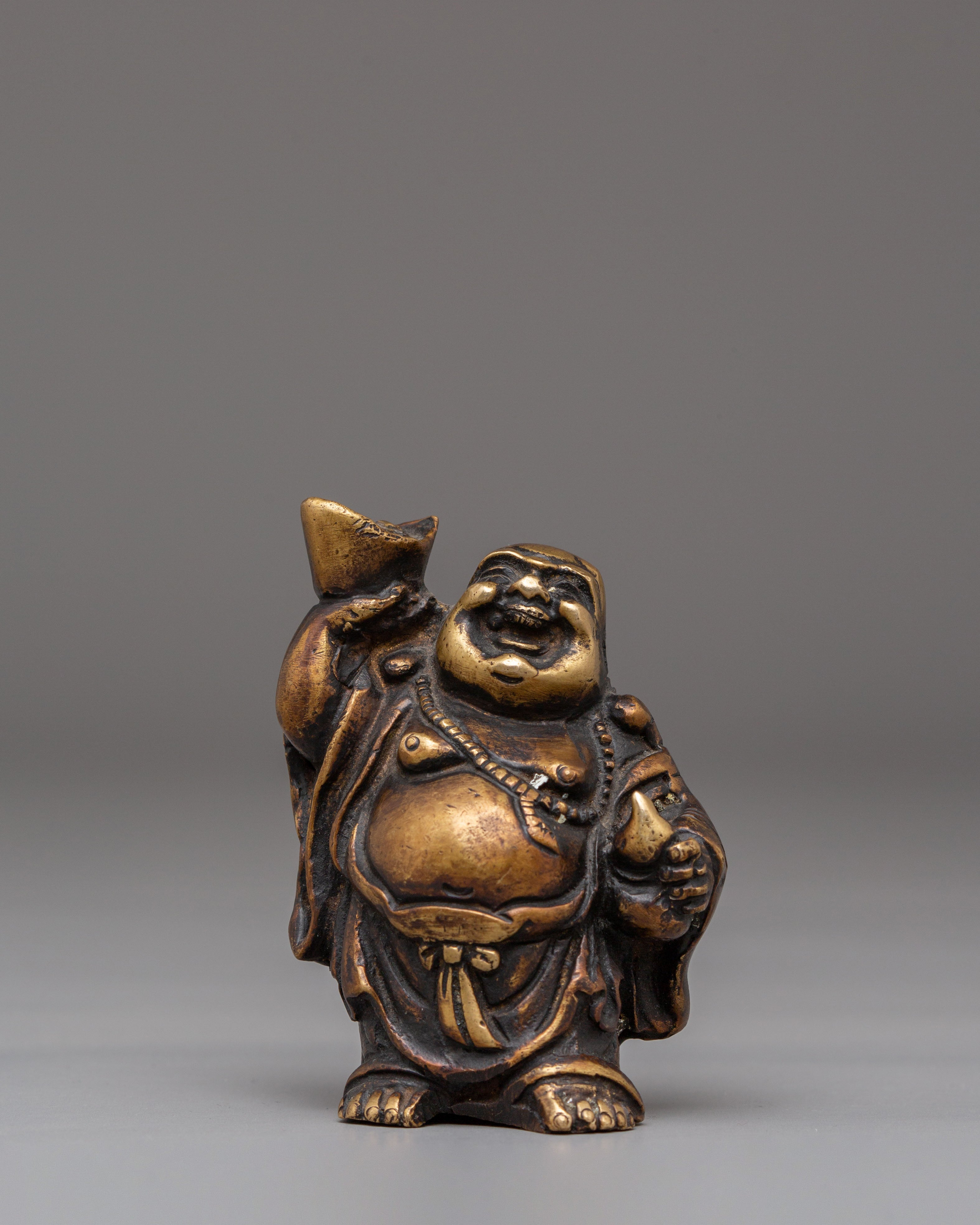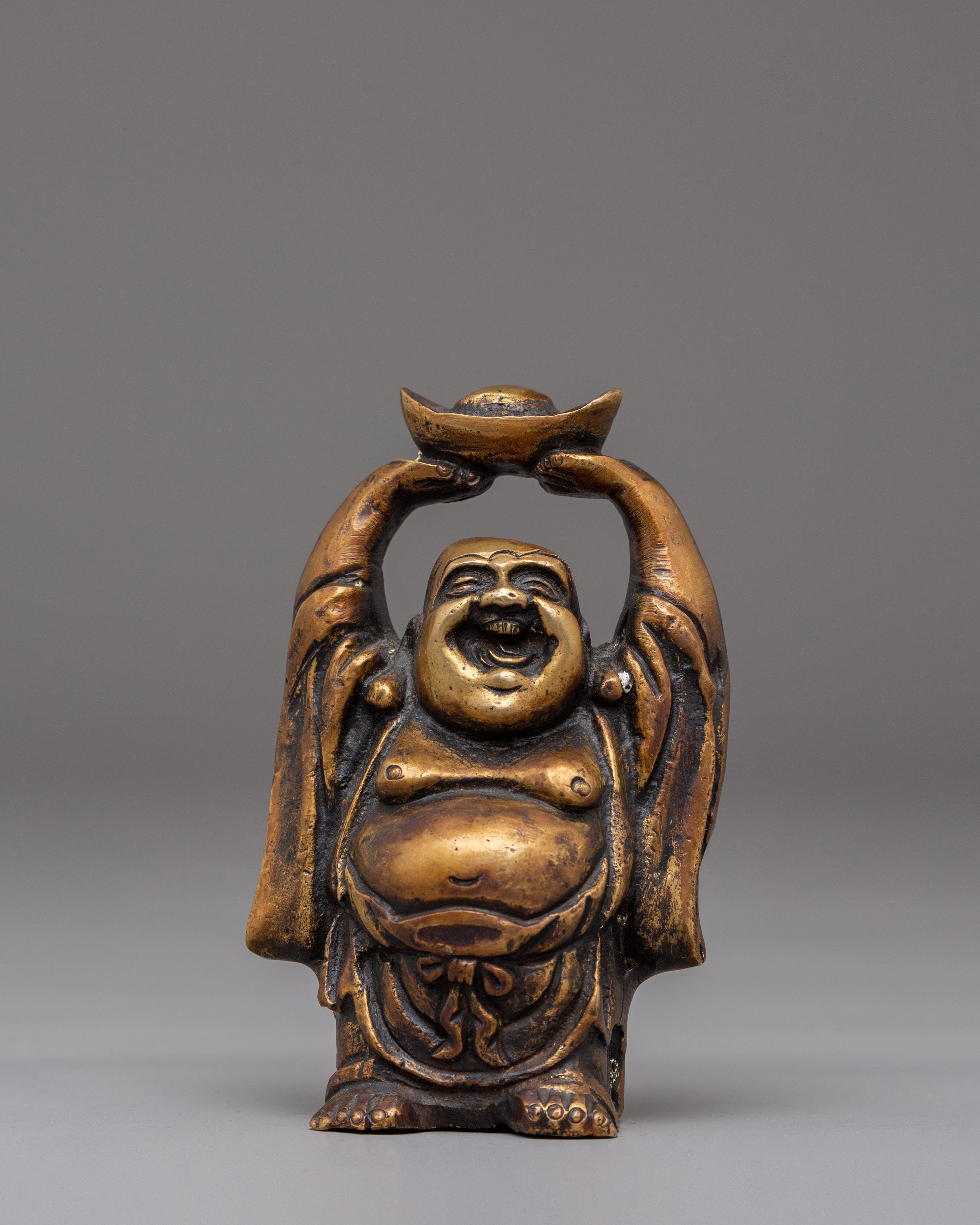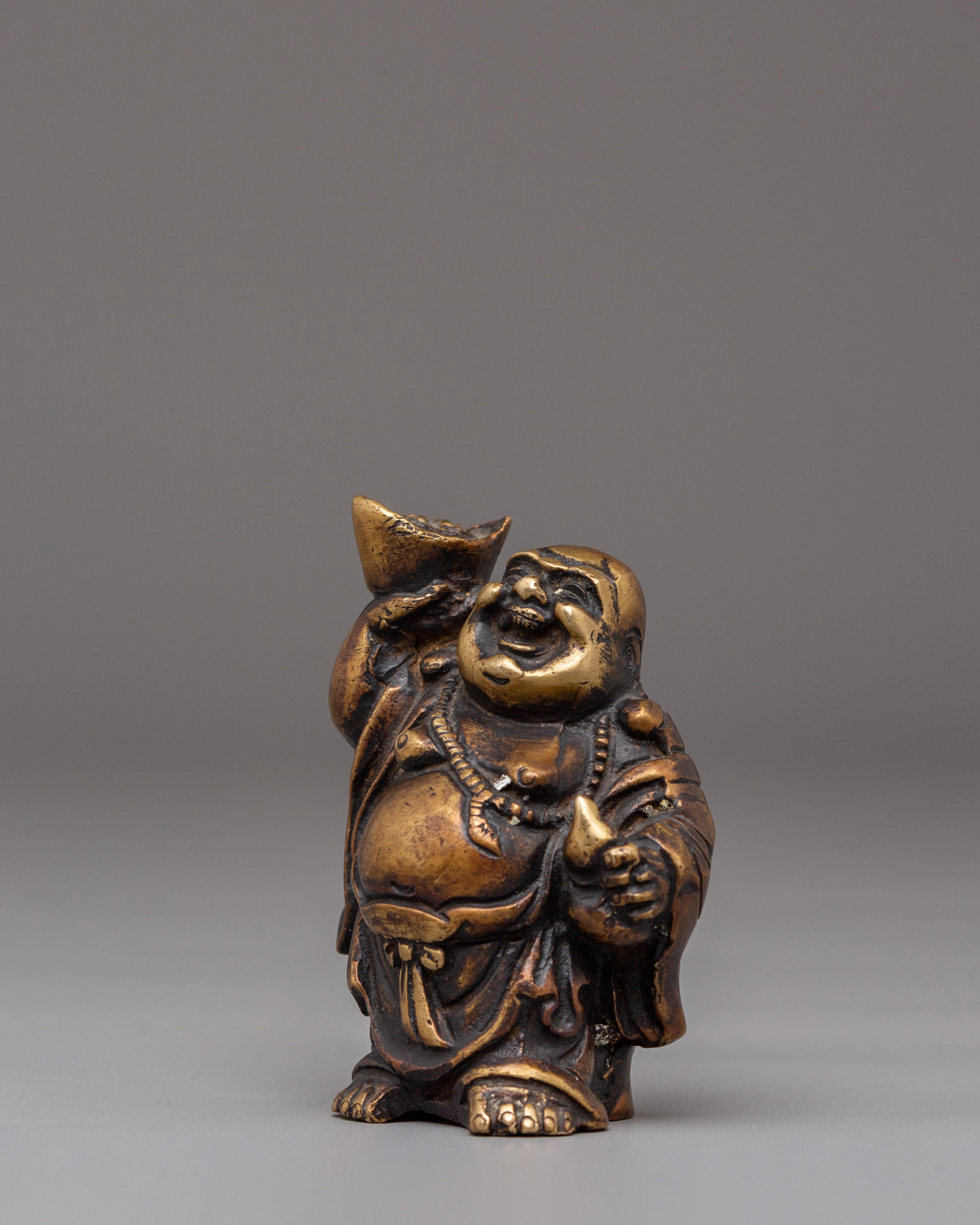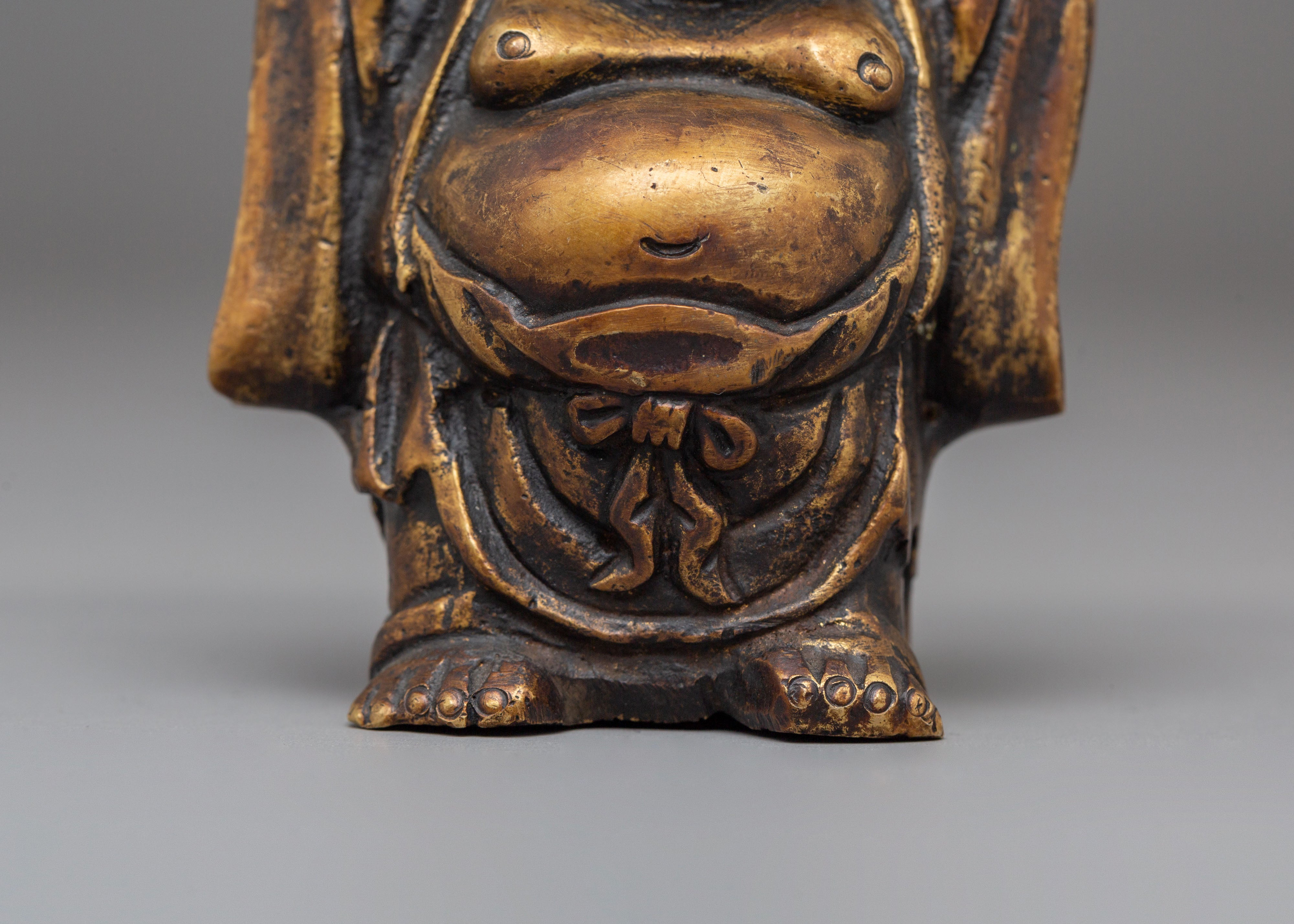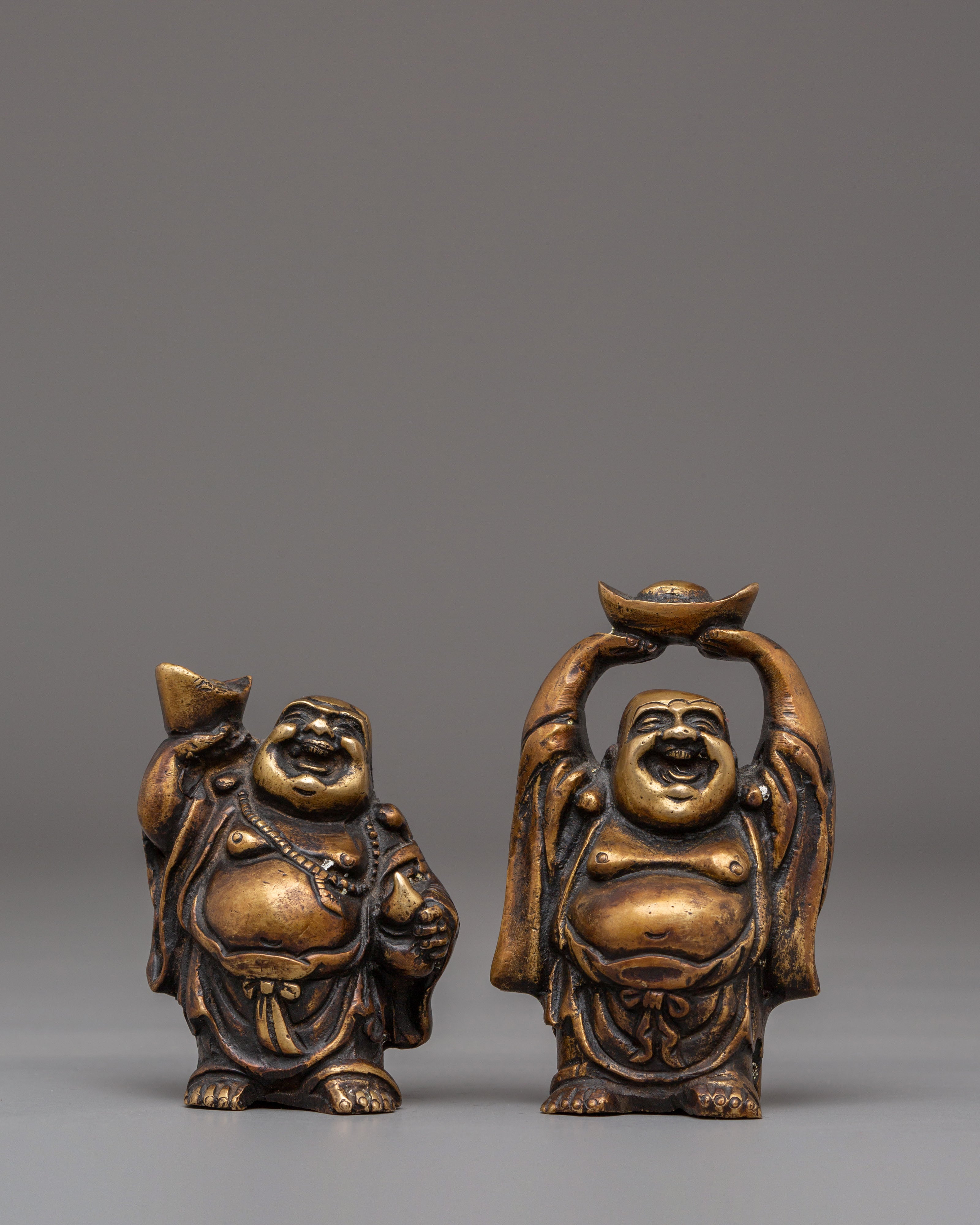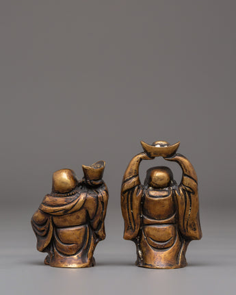 Each Laughing Buddha figurine is intricately handcrafted with joyful facial expressions, rounded forms, and relaxed postures—traditional motifs that represent contentment, generosity, and freedom from worries. The detailed craftsmanship highlights flowing robes and symbolic gestures often associated with wealth, good fortune, and protection. Bronze, known for its grounding and protective qualities, amplifies the spiritual presence of this handmade bronze Laughing Buddha set while complementing both traditional and modern interiors.