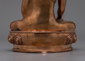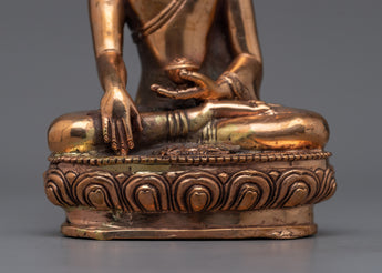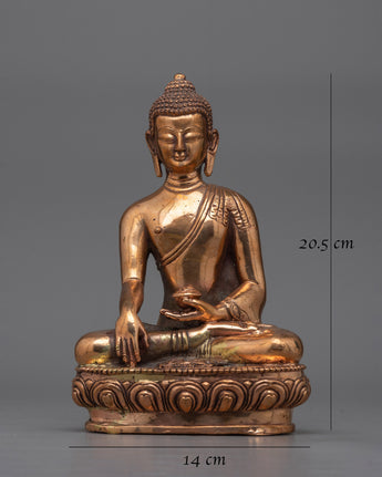 Our Buddha Shakyamuni statue, skillfully created using a solid copper body and completed with radiant gold plating, will brighten your room with its tranquil presence. This statue, which stands 20.5 cm tall on a 14-centimeter base and weighs 1.56 kg, features fine detailing.